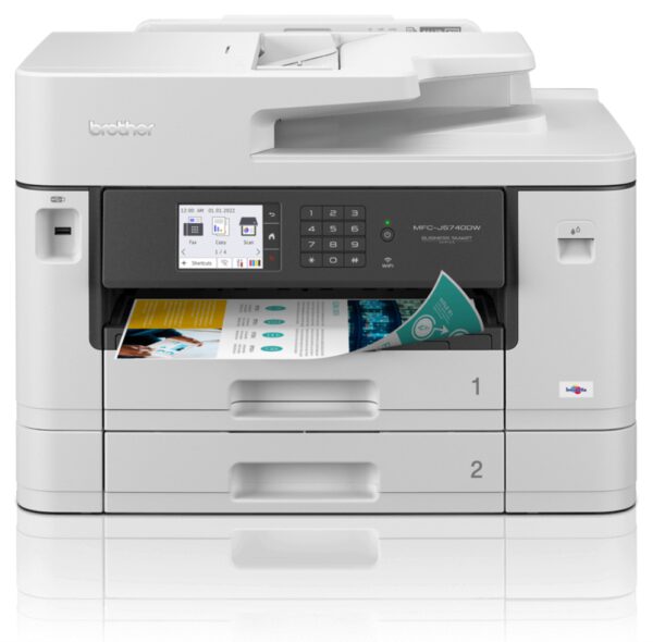 Impresora multifunción profesional A4 con impresión hasta A3, pantalla color táctil de 8,8cm y capacidad para 600 hojas de papel. Doble cara automática en todas las funciones hasta A4.Con una velocidad de impresión de 28ppm en monocromo y color (ISO 24734), y un tiempo de impresión de primera página de tan sólo 5 segundos (ISO 17629), conseguirás documentos de gran calidad y sin complicaciones. Conexión por Ethernet o WiFi.Pensada para satisfacer las necesidades de pequeñas oficinas o grupos de trabajo de empresas de mayor dimensión.Impresoras de tinta profesional A3